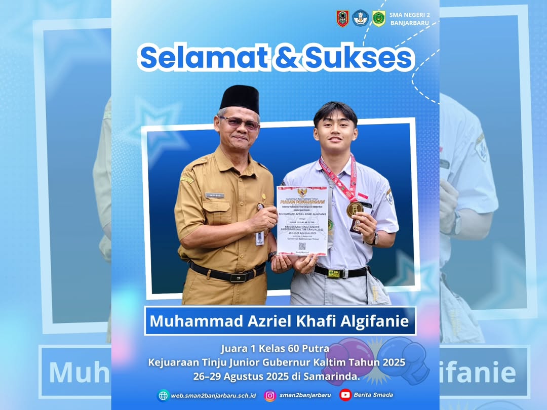 Selamat kepada Muhammad Azriel Khafi Algifanie yang telah meraih Juara 1 Kelas 60 Putra pada Kejuaraan Tinju Junior Gubernur Kaltim Tahun 2025, yang diselenggarakan pada 26–29 Agustus 2025 di Samarinda.