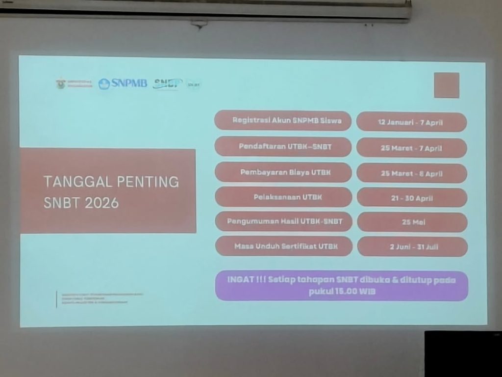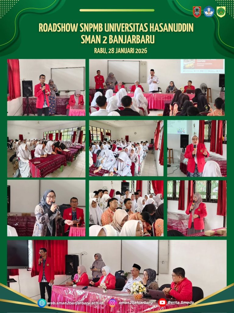 Roadshow SNPMB Universitas Hasanuddin 2026 dilaksanakan di SMA Negeri 2 Banjarbaru pada Rabu, 28 Januari 2026. Kegiatan ini diikuti oleh siswa kelas XII dari SMA Negeri 2 Banjarbaru, SMK Telkom Banjarbaru, SMA IT Qardhan Hasana, SMA Negeri 1 Martapura, serta SMA Negeri 1 Banjarbaru. Kegiatan ini memberikan pemahaman penting terkait SNBT–UTBK 2026, kepatuhan terhadap jadwal dan ketentuan, hingga pentingnya kejujuran dalam proses seleksi masuk perguruan tinggi negeri.