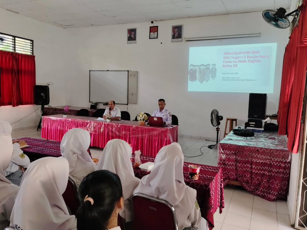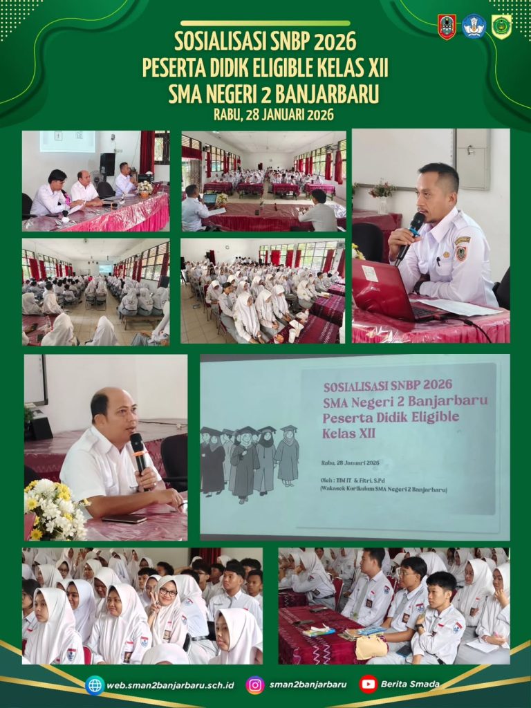 SMAN 2 Banjarbaru melaksanakan kegiatan Sosialisasi SNBP 2026 bagi peserta didik eligible kelas XII pada Rabu, 28 Januari 2026. Kegiatan ini disampaikan oleh Tim IT bersama Fitri (Wakasek Kurikulum) sebagai bentuk pendampingan dan pembekalan informasi bagi siswa dalam menghadapi jalur seleksi masuk perguruan tinggi negeri.